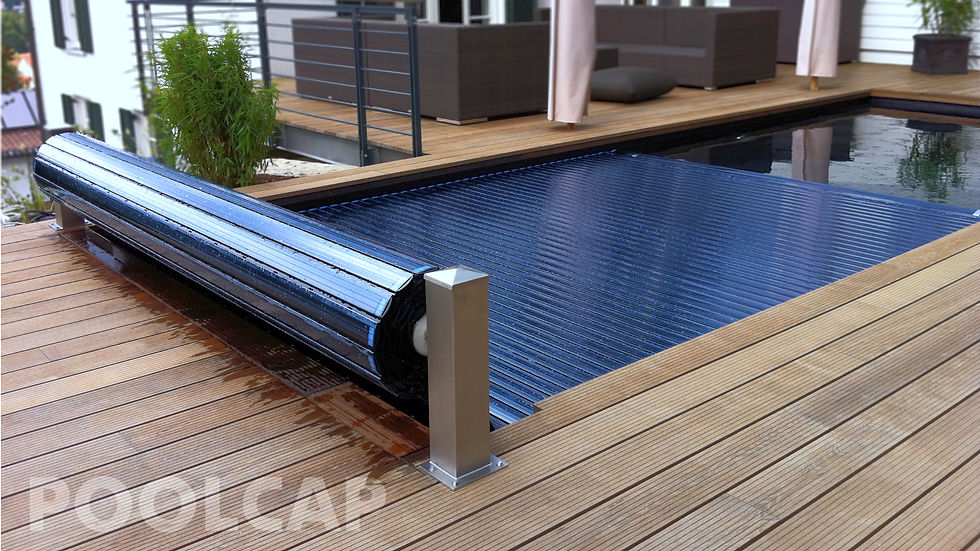 Formschöne sehr unauffällige und schlanke Poolabdeckung mit Rohrmotor.